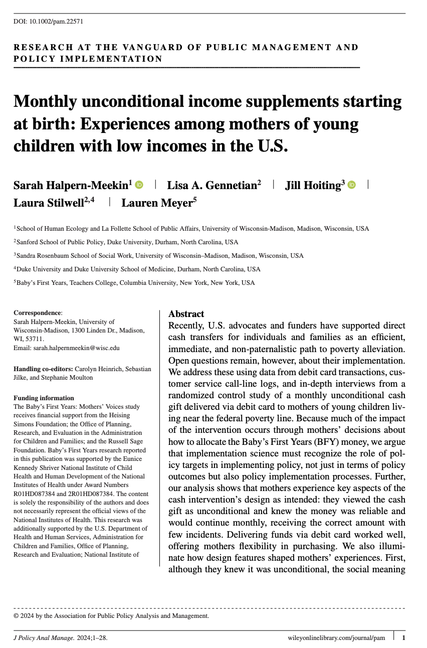 Monthly unconditional income supplements starting at birth: Experiences among mothers of young children with low incomes in the U.S: Baby’s First Years (2024)